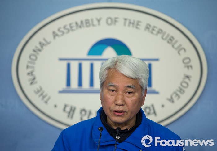 (서울=포커스뉴스) 경기도 용인갑 전략공천된 더불어민주당 백군기 의원이 21일 오후 서울 여의도 국회 정론관에서 기자회견을 하고 있다.