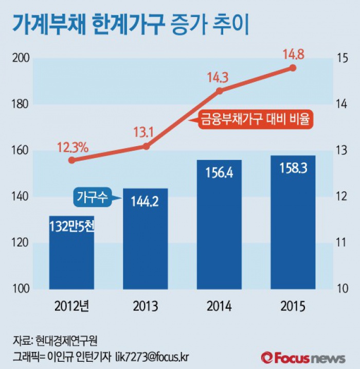 (서울=포커스뉴스) 20일 현대경제연구원이 발표한 “가계부채 한계가구의 특징과 시사점”에 따르면 2012년 132.5만 가구에서 2015년 158.3만 가구로 증가하면서 금융부채가구 대비 한계가구 비중도 12.3%에서 14.8%로 2.5%p 상승하였다.