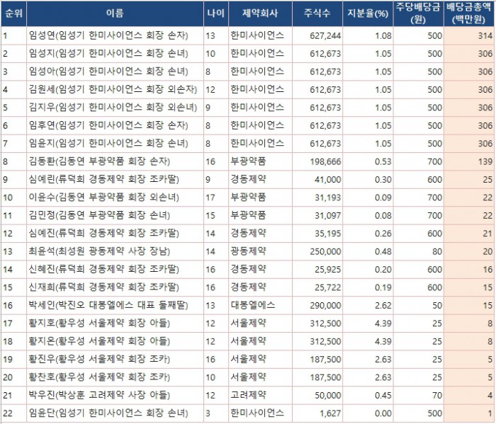 주요 상장제약사의 미성년자 주식부호 가운데 배당금총액 1위는 한미사이언스 일가의 장손인 임성연 군이었다.