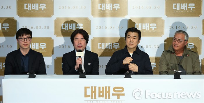(서울=포커스뉴스) 21일 오후 서울 광진구 건대입구 롯데시네마에서 열련 영화 '대배우' 언론시사회에 참석한 배우 오달수가 인사말을 하고 있다. 왼쪽부터 영화감독 석민우, 배우 오달수, 윤제문, 이경영.