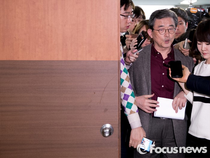 (서울=포커스뉴스) 이한구 새누리당 공천관리위원장과 위원들이 21일 오후 서울 여의도 당사에서 20대 총선 여론조사 경선 결과 발표를 마친 뒤 퇴장하고 있다.
