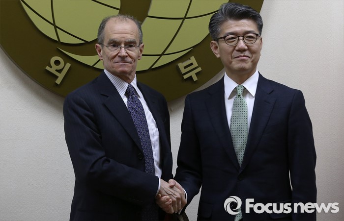 (서울=포커스뉴스) 21일 오후 서울 종로구 외교부 청사에서 열린 한미 고위급 대북제재 협의에서 대니얼 프리드 미국 국무부 제재정책조정관과 김홍균 한반도평화교섭본부장이 악수를 하고 있다.