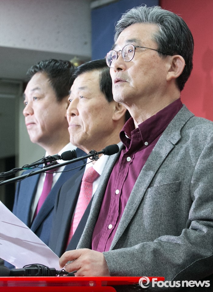 (서울=포커스뉴스) 이한구 새누리당 공천관리위원장과 위원들이 21일 오후 서울 여의도 당사에서 20대 총선 여론조사 경선 결과 발표를 하고 있다. 왼쪽부터 박종희 위원, 황진하 부위원장, 이 위원장.