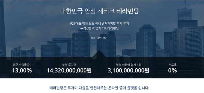 테라펀딩은 현재까지 빠르게 성장하고 있다. 설립이후 3월21일 최근까지 누적투자 140억 원을 돌파했고 연평균 수익률 13%, 부도율 0%를 기록하고 있다.