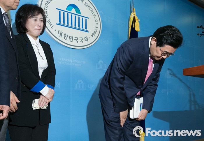 (서울=포커스뉴스) 20대 총선을 앞두고 공천 배제(컷오프)된 전병헌 더불어민주당 의원이 22일 오전 서울 여의도 국회 정론관에서 대선승리를 위한 백의종군 선언 기자회견을 마친 뒤 인사하고 있다. 왼쪽은 전 의원 아내 조영아 씨.