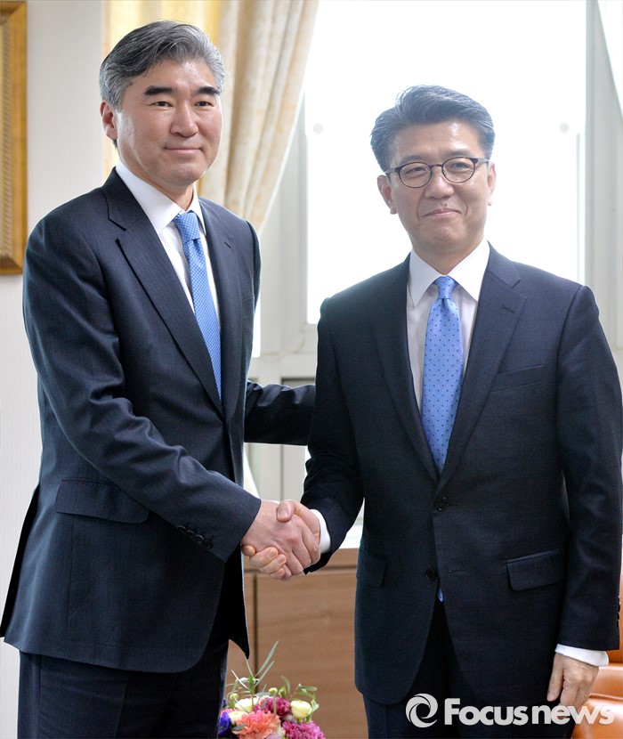 (서울=포커스뉴스) 성김(왼쪽) 국무부 대북정책특별대표와 김홍균 한반도평화교섭본부장이 22일 서울 종로구 외교부에서 열린 '한·미 북핵 6자회담'에 참석해 인사를 나누고 있다.