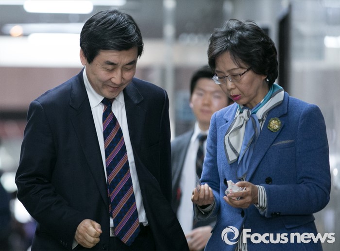 (서울=포커스뉴스) 이종걸(왼쪽) 더불어민주당 원내대표가 22일 오후 서울 여의도 국회에서 비례대표 순번 논란과 관련 당무를 거부했던 김종인 비대위 대표 주재로 열린 비공개 회의에 참석하며 20대 총선 경선에서 탈락한 한 예비후보의 이야기를 듣고 있다.