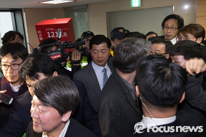 (서울=포커스뉴스) 22일 오후 서울 마포구 국민의당 당사에서 안철수 국민의당 상임공동대표가 PI론칭 발표를 마친 후 브리핑실을 나서다 공천에서 떨어진 전 농구선수 김해곤 씨의 강한 항의를 피해 당사를 떠나고 있다.