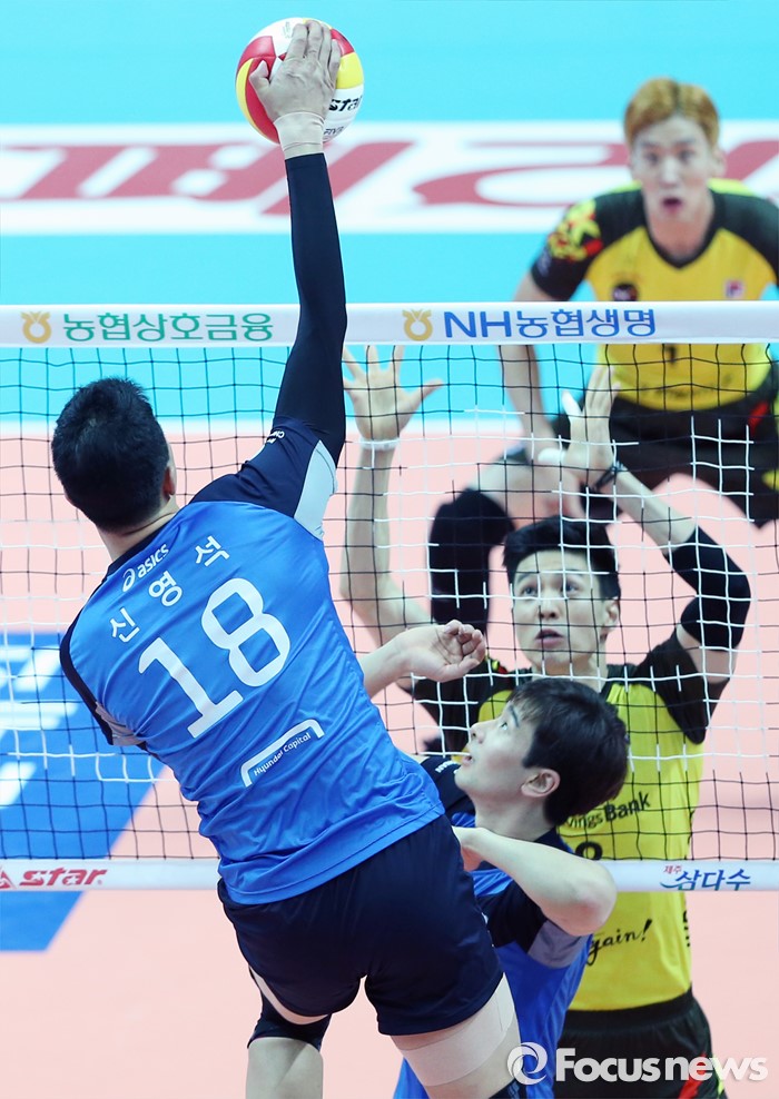 (안산=포커스뉴스) 22일 안산상록수체육관에서 열린 2015-2016 V-리그 남자부 챔피언결정전 3차전 OK저축은행-현대캐피탈 경기에서 현대캐피탈 신영석이 세터 노재욱의 토스를 받아 송공을 하고 있다.