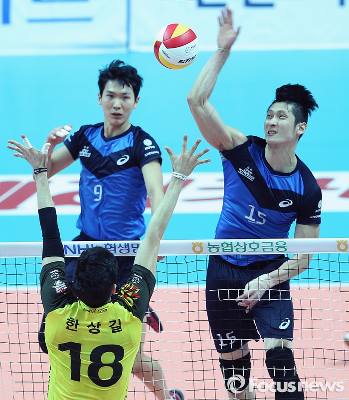 (안산=포커스뉴스) 22일 안산상록수체육관에서 열린 2015-2016 V-리그 남자부 챔피언결정전 3차전 OK저축은행-현대캐피탈 경기에서 현대캐피탈 문성민이 OK저축은행 한상길의 블로킹을 앞에 두고 공격을 시도하고 있다.