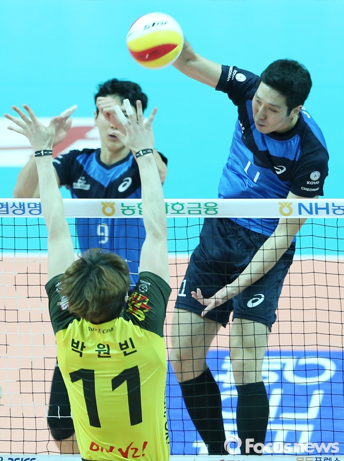 (안산=포커스뉴스) 22일 안산상록수체육관에서 열린 2015-2016 V-리그 남자부 챔피언결정전 3차전 OK저축은행-현대캐피탈 경기에서 현대캐피탈 최민호가 OK저축은행 박원빈의 블로킹 위로 스파이크를 날리고 있다.