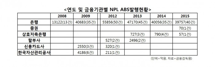 한편, NPL유동화발행(ABS)금액은 감소 추세다. 금융감독원에 따르면 2015년 전 금융사의 NPL ABS 발행금액은 3조9884억원으로 2014년 4조846억원 대비 2.4% 감소했다. 2013년 발행금액은 5조393억원이다. NPL ABS물량이 크게 증가했던 금융위기 직후인 2009년의 발행금액도 4조7414억원이라는 점을 감안할 때, 올해 NPL ABS발행이 증가할 것으로 보기는 어려운 실정이다.