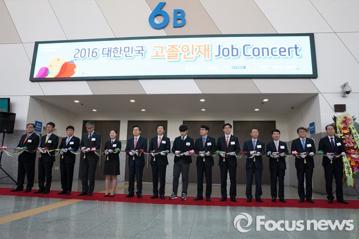(고양=포커스뉴스) 23일 오전 경기도 고양시 킨텍스 제2전시장에서 열린 2016 대한민국 고졸인재 잡 콘서트(Job Concert)에서 황교안 국무총리가 참석해 개막 테이프 커팅을 하고 있다. 왼쪽 네번째 부터 이영 교육부 차관, 김연희 대동세무고 학생, 황총리, 김기웅 한국경제신문사장, 강정우 서울공업고학생, 고영선 고용노동부 차관.