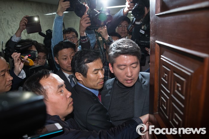 (서울=포커스뉴스) 23일 오전 서울 여의도 국회에서 열린 국민의당 비공개 최고위원회의 도중 공천탈락 후 결선투표를 주장하고 있는 김승남 의원과 지지자들이 회의장 진입을 시도하며 당직자들에게 항의하고 있다.