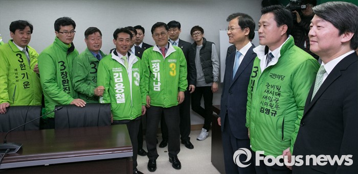 (서울=포커스뉴스) 안철수 국민의당 상임공동대표와 천정배 공동대표가 23일 오전 서울 마포구 당사에서 열린 20대 총선 공천장 수여식에 참석해 예비후보들과 기념촬영을 하고 있다. 국민의당은 이날 국회 본청에서 공천장 수여식 행사를 진행하려고 했지만, 공천에서 탈락한 김승남 의원 등 지지자들의 여론조사 관련 항의에 급하게 장소를 옮겨 진행했다.