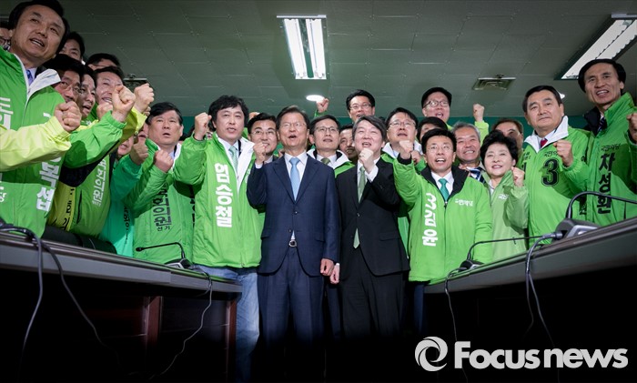 (서울=포커스뉴스) 안철수 국민의당 상임공동대표와 천정배 공동대표가 23일 오전 서울 마포구 당사에서 열린 20대 총선 공천장 수여식에 참석해 예비후보들과 함께 파이팅을 외치며 포즈를 취하고 있다. 국민의당은 이날 국회 본청에서 공천장 수여식 행사를 진행하려고 했지만, 공천에서 탈락한 김승남 의원 등 지지자들의 여론조사 관련 항의에 급하게 장소를 옮겨 진행했다.