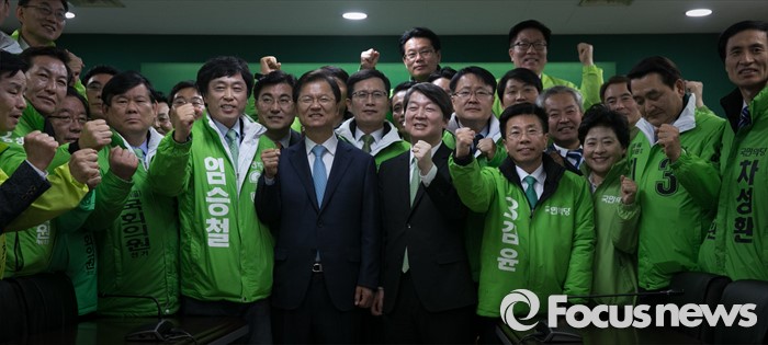 (서울=포커스뉴스) 안철수 국민의당 상임공동대표와 천정배 공동대표가 23일 오전 서울 마포구 당사에서 열린 20대 총선 공천장 수여식에 참석해 예비후보들과 함께 파이팅을 외치며 포즈를 취하고 있다. 국민의당은 이날 국회 본청에서 공천장 수여식 행사를 진행하려고 했지만, 공천에서 탈락한 김승남 의원 등 지지자들의 여론조사 관련 항의에 급하게 장소를 옮겨 진행했다.