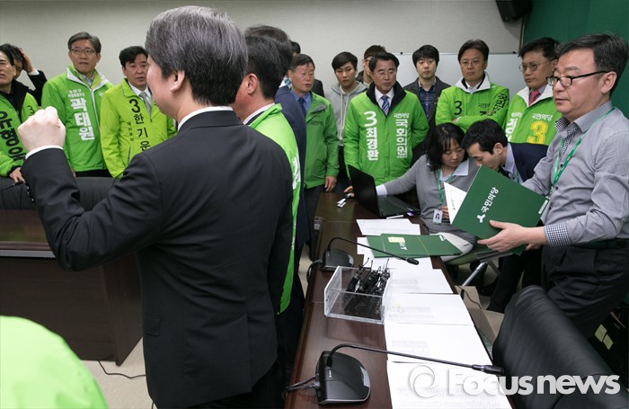 (서울=포커스뉴스) 안철수 국민의당 상임공동대표와 천정배 공동대표가 23일 오전 서울 마포구 당사에서 열린 20대 총선 공천장 수여식에 참석해 예비후보들과 기념촬영을 하고 있는 동안 뒷자리의 당직자들이 공천장 준비를 하고 있다. 국민의당은 이날 국회 본청에서 공천장 수여식 행사를 진행하려고 했지만, 공천에서 탈락한 김승남 의원 등 지지자들의 여론조사 관련 항의에 급하게 장소를 옮겨 진행했다.