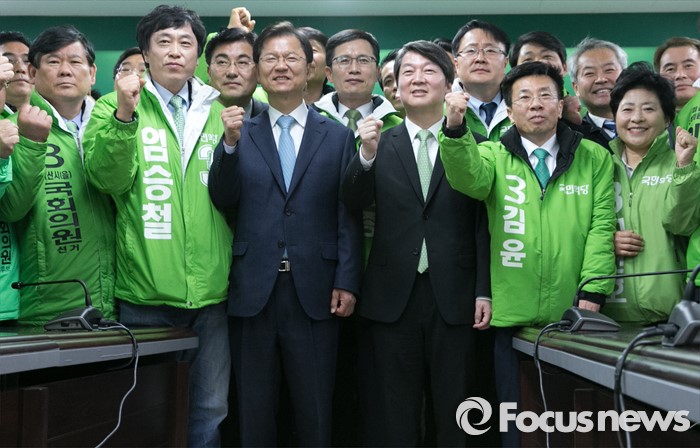 (서울=포커스뉴스) 안철수 국민의당 상임공동대표와 천정배 공동대표가 23일 오전 서울 마포구 당사에서 열린 20대 총선 공천장 수여식에 참석해 예비후보들과 함께 파이팅을 외치며 포즈를 취하고 있다. 국민의당은 이날 국회 본청에서 공천장 수여식 행사를 진행하려고 했지만, 공천에서 탈락한 김승남 의원 등 지지자들의 여론조사 관련 항의에 급하게 장소를 옮겨 진행했다.