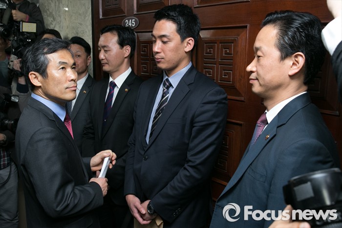 (서울=포커스뉴스) 공천 탈락한 김승남(왼쪽) 의원이 23일 오전 서울 여의도 국회에서 열린 국민의당 비공개 최고위원회의에 진입을 시도하고 있다.