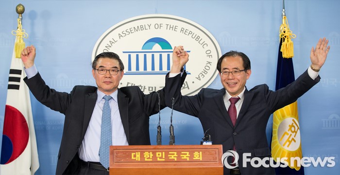 (서울=포커스뉴스) 20대 총선 서울 강남갑 선거구에 전략 공천된 김성곤(오른쪽) 더불어민주당 의원이 23일 오후 서울 여의도 국회 정론관에서 김성욱 전 지역위원장과 함께 두 손을 들고 파이팅 외치고 있다.