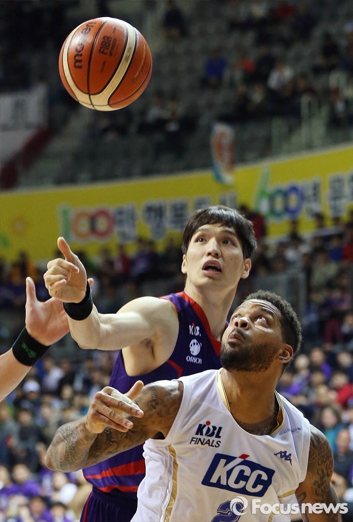 (고양=포커스뉴스) 23일 고양체육관에서 열린 2015-2016 프로농구 챔피언결정전 3차전 오리온-KCC경기에서 KCC 에밋과 오리온 장재석이 바운드된 볼을 바라보고 있다.