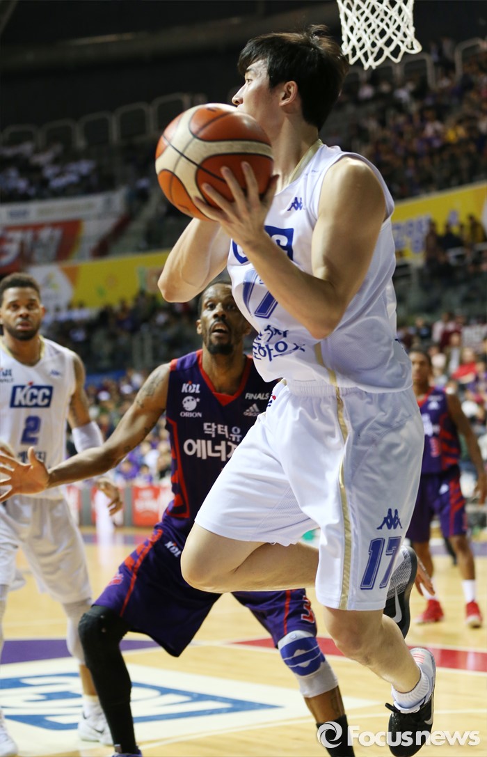 (고양=포커스뉴스) 23일 고양체육관에서 열린 2015-2016 프로농구 챔피언결정전 3차전 오리온-KCC경기에서 KCC 엔드라인으로 아웃되는 볼을 살리며 패스를 시도하고 있다.