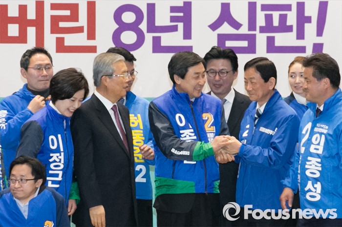 (서울=포커스뉴스) 이종걸(앞줄 오른쪽 세번째) 더불어민주당 원내대표와 진영(앞줄 오른쪽 두번째) 의원이 24일 오전 서울 여의도 국회에서 공천장 수여식에 참석해 기념촬영 후 악수하고 있다. 앞줄 오른쪽 네번째는 김종인 더불어민주당 비대위 대표.