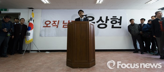 (인천=포커스뉴스) 새누리당을 탈당한 윤상현 의원이 24일 오전 인천 남구 지역구 사무실에서 무소속 출마 선언 기자회견을 하고 있다.