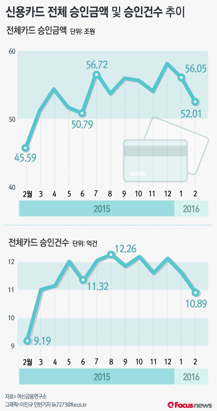 (서울=포커스뉴스) 24일 여신금융연구소의 '2016년 2월 카드승인 실적 분석'을 살펴보면 지난달 전체 카드승인금액은 52조100억원으로 전년 동월 대비 14.1% 늘었다. 전체카드 승인건수는 10.89억건으로 전년동월대비 18.5% 증가했다.