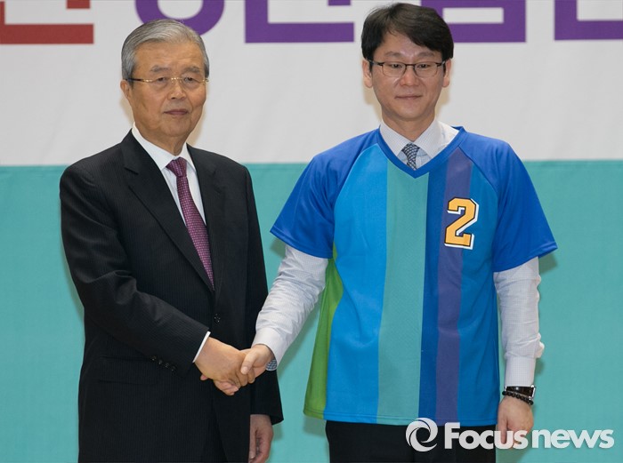 (서울=포커스뉴스) 김종인 더불어민주당 비대위 대표가 24일 오전 서울 여의도 국회에서 공천장 수여식에 참석해 권혁기 비례대표 후보와 기념촬영을 하고 있다.