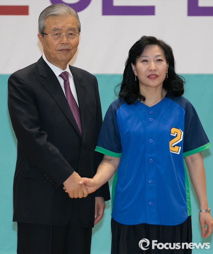(서울=포커스뉴스) 김종인(왼쪽) 더불어민주당 비대위 대표가 24일 오전 서울 여의도 국회에서 공천장 수여식에 참석해 박기영 비례대표 후보와 기념촬영을 하고 있다.