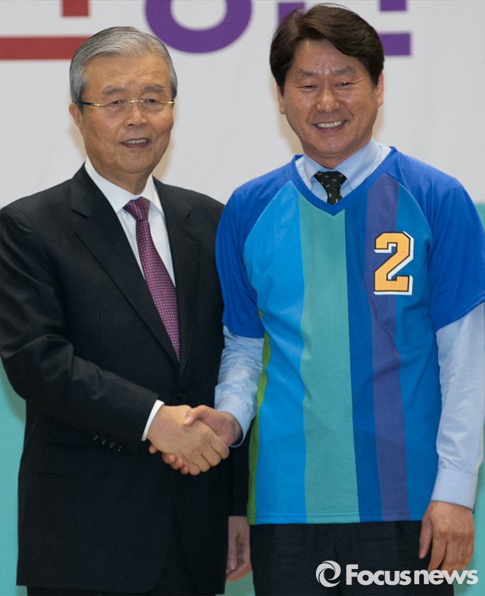 (서울=포커스뉴스) 김종인(왼쪽) 더불어민주당 비대위 대표가 24일 오전 서울 여의도 국회에서 공천장 수여식에 참석해 심기준 비례대표 후보와 기념촬영을 하고 있다.