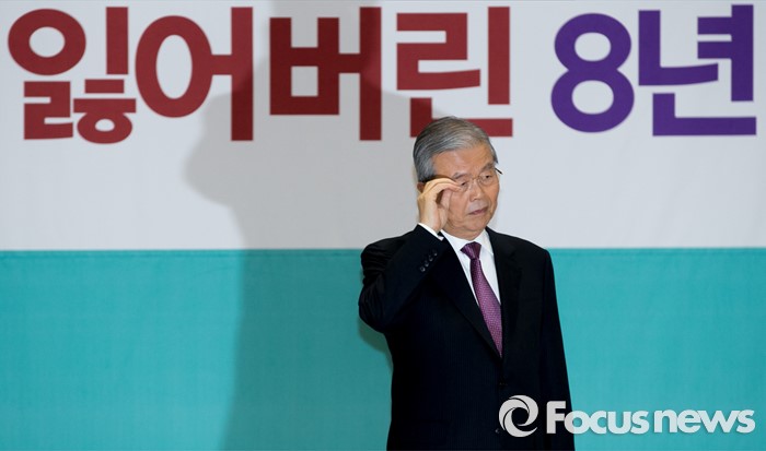 (서울=포커스뉴스) 김종인 더불어민주당 비대위 대표가 24일 오전 서울 여의도 국회에서 공천장 수여식에 참석해 후보들과 기념촬영 중 안경을 고쳐쓰고 있다.