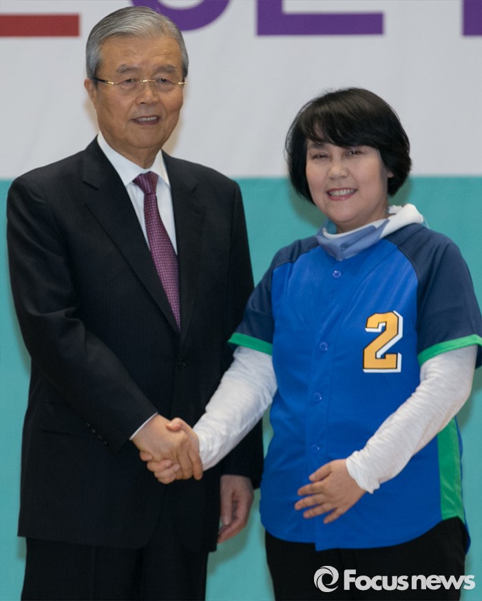 (서울=포커스뉴스) 김종인(왼쪽) 더불어민주당 비대위 대표가 24일 오전 서울 여의도 국회에서 공천장 수여식에 참석해 정춘숙 비례대표 후보와 기념촬영을 하고 있다.