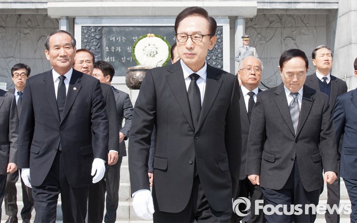 (대전=포커스뉴스) 이명박 전 대통령이 제1회 서해수호의날을 하루 앞둔 24일 오전 대전 유성구 국립대전현충원을 참배한 뒤 이동하고 있다.