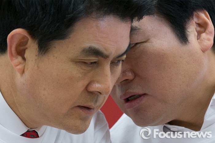 김무성 대표의 이와 같은 방침이 현실화될 경우 유재길(서울 은평을)·유영하(서울 송파을)·정종섭(대구 동갑)·이재만(대구 동을)·추경호(대구 달성) 등 이른바 '진박' 예비후보들은 20대 총선에 출마할 수 없게된다.(서울=포커스뉴스) 원유철(오른쪽) 새누리당 원내대표와 김태호 최고위원이 21일 오전 서울 여의도 국회에서 열린 최고위원회의에 참석해, 귀엣말을 하고 있다. 2016.03.21 박철중 기자