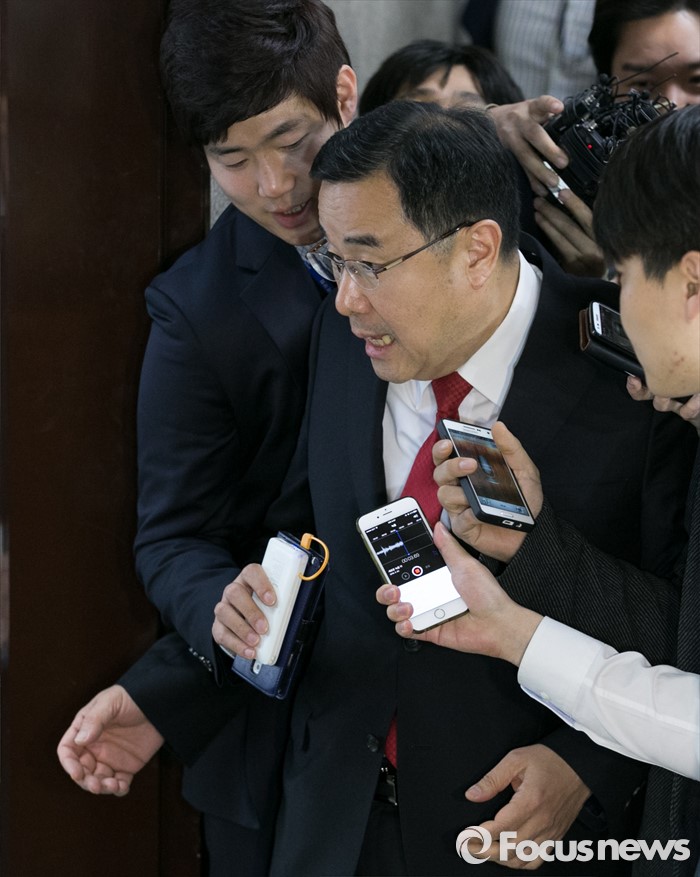 (서울=포커스뉴스) 김무성 새누리당 대표가 유승민 의원 지역구를 포함 5개 지역에 대한 최종 의결 거부하고 부산으로 떠난 24일 오후 서울 여의도 국회에서 열린 비공개 최고위원 간담회에 김정훈 정책위의장이 취재진 질문을 받으며 참석하고 있다.