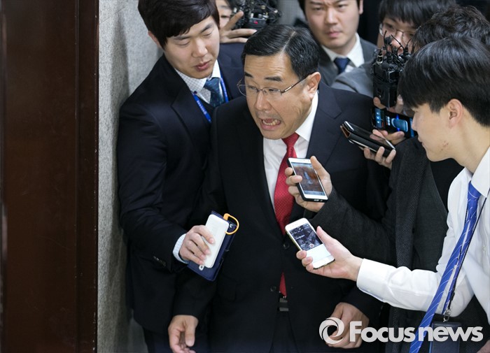 (서울=포커스뉴스) 김무성 새누리당 대표가 유승민 의원 지역구를 포함 5개 지역에 대한 최종 의결 거부하고 부산으로 떠난 24일 오후 서울 여의도 국회에서 열린 비공개 최고위원 간담회에 김정훈 정책위의장이 취재진 질문을 받으며 참석하고 있다.