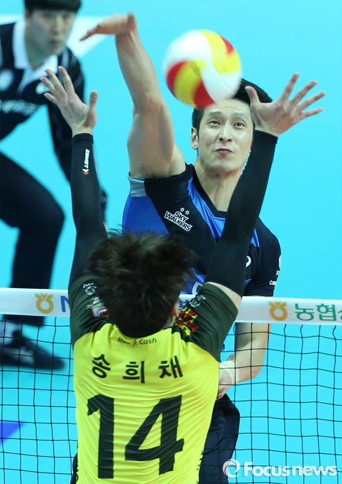 (안산=포커스뉴스) 24일 안산상록수체육관에서 열린 2015-2016 V-리그 남자부 챔피언결정전 4차전 OK저축은행-현대캐피탈 경기에서 현대캐피탈 문성민이 OK저축은행 송희채의 블로킹에 대고 스파이크 공격을 하고 있다.
