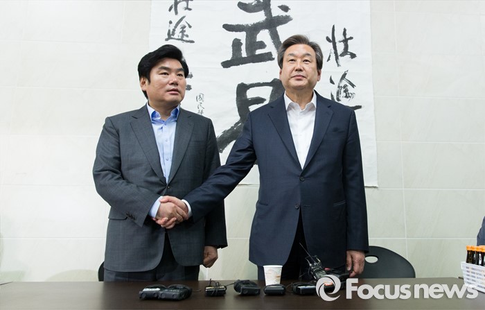 (부산=포커스뉴스) 당 공천관리위원회의 공천안에 반발해 최고위원회의 소집을 거부한 김무성(오른쪽) 새누리당 대표와 설득에 나선 원유철 원내대표가 24일 오후 부산 영도구 김 대표 사무실에서 만나 악수를 나누고 있다.