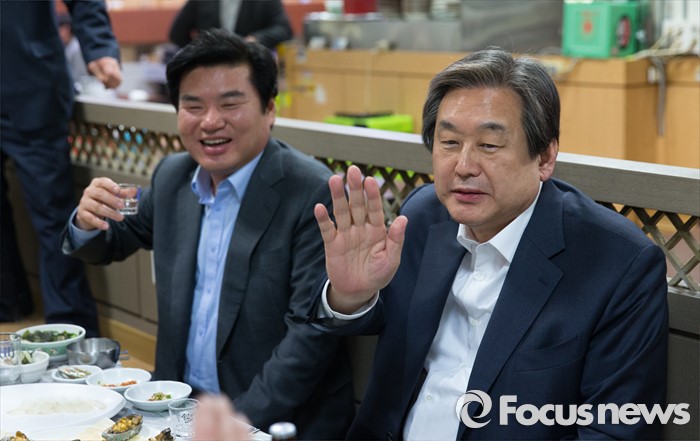(부산=포커스뉴스) 당 공천관리위원회의 공천안에 반발해 최고위원회의 소집을 거부한 김무성 새누리당 대표와 설득에 나선 원유철 원내대표가 24일 오후 부산 중구 자갈치시장에서 만나 저녁식사를 하며 이야기를 나누고 있다.