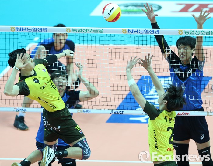 (안산=포커스뉴스) 24일 안산상록수체육관에서 열린 2015-2016 V-리그 남자부 챔피언결정전 4차전에서OK저축은행 한상길이 세터 곽명우의 토스를 받아 속공을 시도하고 있다.