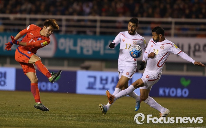 (안산=포커스뉴스) 24일 오후 경기도 안산 와스타디움에서 열린 2018 러시아 월드컵 아시아 2차 예선 7차전 대한민국 대 레바논 경기에서 한국영 선수가 슈팅을 하고 있다.