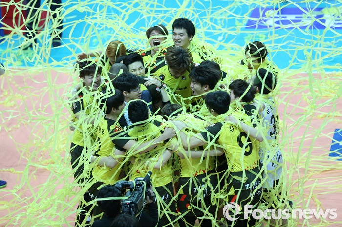 (안산=포커스뉴스) 24일 안산상록수체육관에서 열린 2015-2016 V-리그 남자부 챔피언결정전 4차전에서 OK저축은행이 현대캐피탈을 물리치고 3승1패로 2연패를 달성했다. 김세진 감독과 선수들이 한데 엉켜 우승의 기쁨을 나누고 있다.
