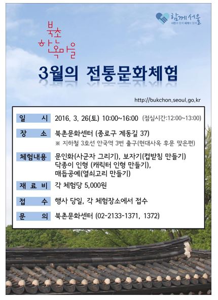 (서울=포커스뉴스) 서울시는 26일 오전 10시부터 오후 4시까지 종로수 계동에 위치한 북촌문화센터에서 '3월의 전통문화체험' 행사를 개최한다고 25일 밝혔다.