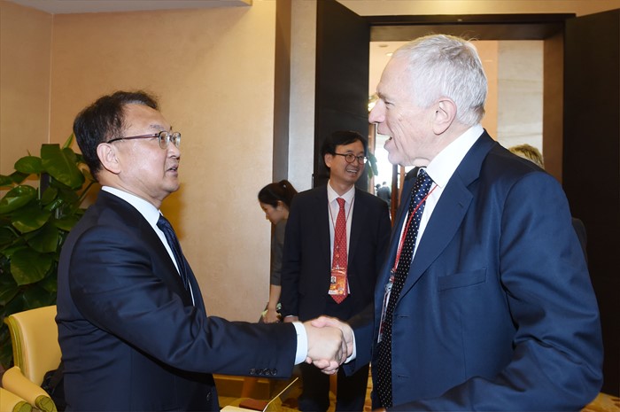 (서울=포커스뉴스) 2016년 보아오 포럼 연차총회 참석차 중국 하이난을 방문중인 유일호 부총리 겸 기획재정부 장관이 24일 BFA ICC에서 에드먼드 펠프스 컬럼비아대 교수와 면담에 앞서 악수를 하고 있다. <사진제공=기획재정부>