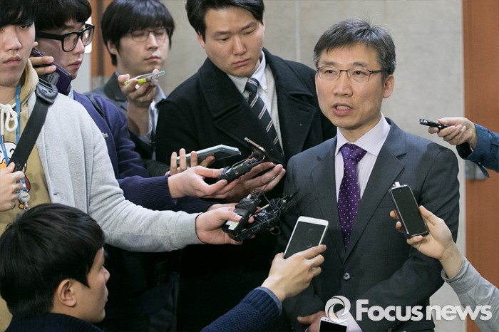 (서울=포커스뉴스) 이상규 전 통합진보당 의원이 25일 오전 서울 여의도 국회 정론관에서 기자회견을 마친 뒤, 기자들의 질문에 답변하고 있다. 지난 2014년 12월 헌법재판소의 통진당 해산결정으로 국회의원직을 박탈당한 이 전 의원은 민중연합당에 입당해, 이번 20대 총선에서 서울 관악을에 출마한다고 밝혔다.