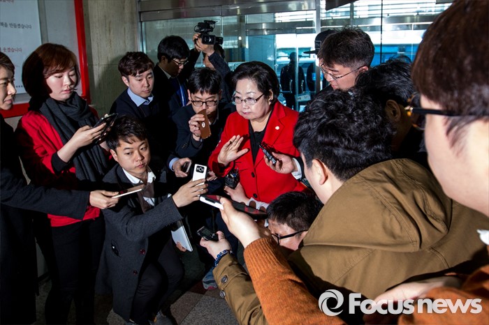 (서울=포커스뉴스) 이른바 진박 후보 공천장에 도장 못찍는다며 김무성 새누리당 대표의 '옥새투쟁'이 이어지고 있는 25일 오전 서울 영등포구 새누리당사 앞에서 김을동 새누리당 최고위원이 회의에 참석하기 위해 이동 하고 있다.