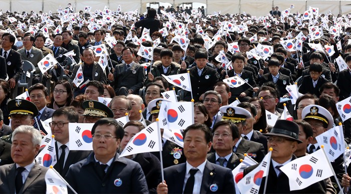 (서울=포커스뉴스) 25일 오전 국립대전현충원에서 열린 1회 서해수호의 날 기념식에 참석자들이 태극기를 흔들며 대합창을 하고 있다. <사진제공=국가보훈처>